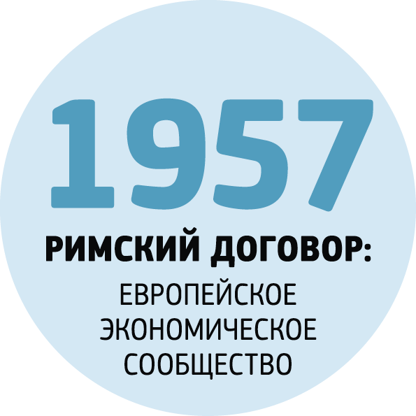 Несколько лет спустя шесть стран-основателей решили распространить свое сотрудничество на другие секторы экономики. В 1957 году был подписан Римский договор о создании Европейского экономического сообщества, который вступил в силу в 1958 году. Его первоначальной целью было развитие торговли и дальнейшая экономическая интеграция между странами-участницами.