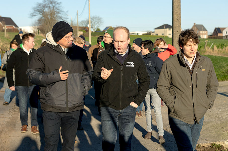 Im Vordergrund, von links nach rechts: Maroš Šefčovič, damals Exekutiv-Vizepräsident der Europäischen Kommission für den europäischen Grünen Deal, interinstitutionelle Beziehungen und Vorausschau, besucht den Hof von Jonas Lemaire-Taelemans, einem belgischen Landwirt, zusammen mit Peter Meedendorp, Präsident des Europäischen Rates der Junglandwirte. Lennik (Belgien), 9. Januar 2024.