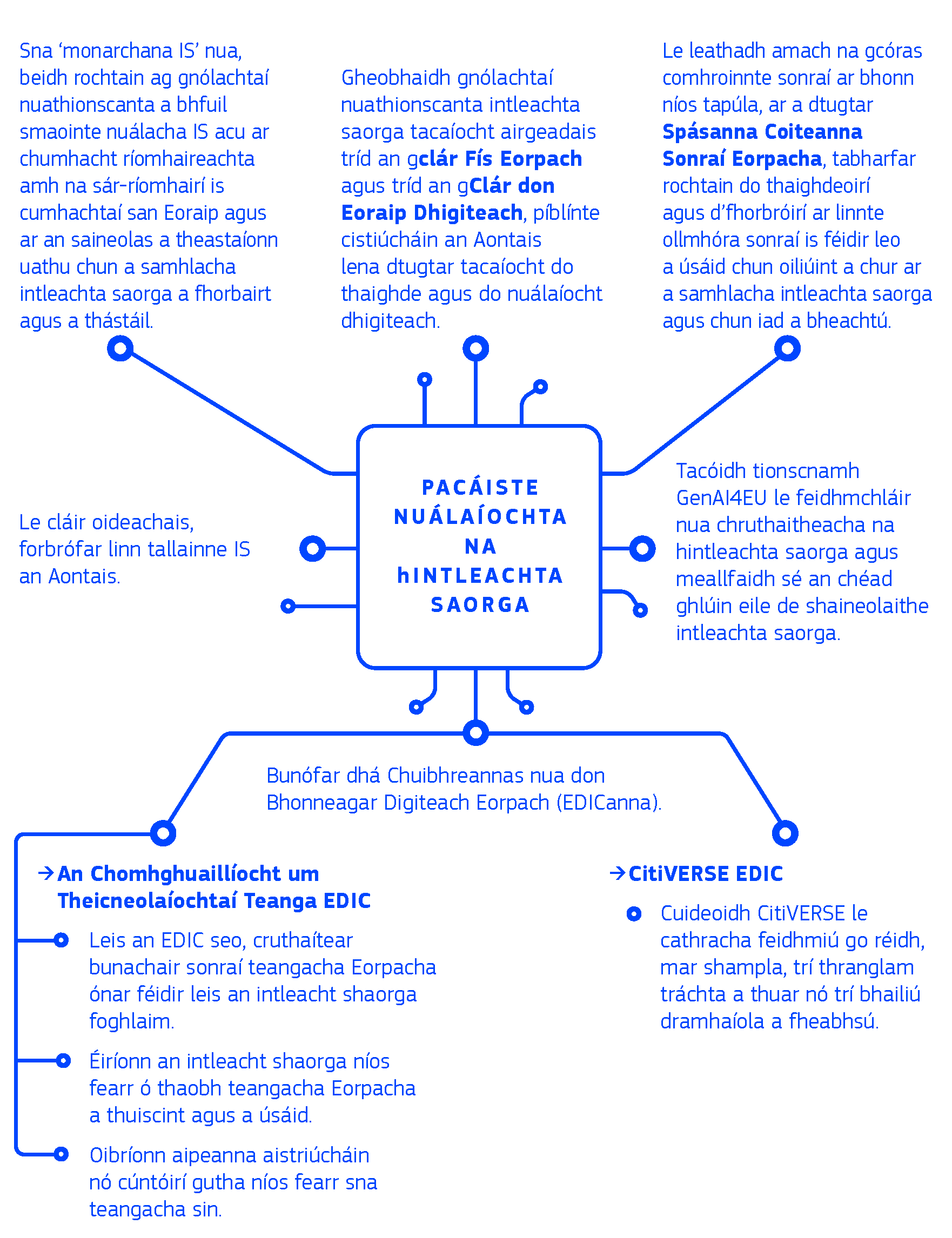Cruthóidh an Oifig Eorpach nua um Intleacht Shaorga - oscail i dtáb nua., a bunaíodh i mí na Bealtaine, treoirlínte soiléire do chuideachtaí agus d’fhorbróirí atá ag obair leis an intleacht shaorga agus cinnteoidh sí go gcuirfear na rialacha nua chun feidhme go haonfhoirmeach ar fud an Aontais. Mar lárionad saineolais IS ar fud an Aontais, beidh tionchar suntasach aige freisin maidir le samhlacha IS a fhormheas, agus féadfaidh sé fiú bac a chur ar úsáid IS a mheastar a bheith claonta nó neamhshábháilte. I mí Mheán Fómhair, sheol an tAontas an Comhshocrú um an Intleacht Shaorga - oscail i dtáb nua. chun eagraíochtaí a spreagadh le pleanáil a dhéanamh roimh ré agus tús a chur lena cheanglais a chur chun feidhme roimh an spriocdháta dlíthiúil.