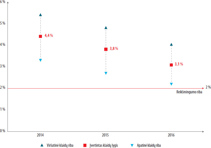 Pastaba:Klaidų lygį mes vertiname naudodami standartinius statistikos metodus. Mes esame 95 % įsitikinę, kad klaidų lygis populiacijoje yra tarp apatinės klaidų ribos ir viršutinės klaidų ribos (išsamiau žr. 2016 m. metinės ataskaitos 1 skyriaus 1.1 priedą).