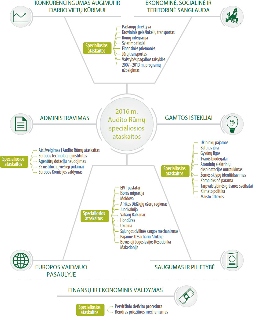- specialiąsias ataskaitas atrinktomis audito temomis, jas skelbiame visu metų laikotarpiu, dažniausiai kaip veiklos auditų rezultatą. 2016 m. paskelbėme 36 specialiąsias ataskaitas;
