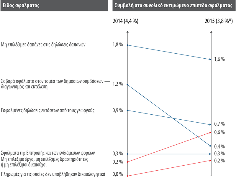 - Το εκτιμώμενο επίπεδο σφάλματος, το οποίο εκφράζει το επίπεδο παρατυπίας, ανέρχεται σε 3,8 % για τις πληρωμές του 2015. Μολονότι συνιστά βελτίωση σε σύγκριση με τα τελευταία χρόνια, παραμένει σημαντικά υψηλότερο του ορίου σημαντικότητας του 2 % που έχουμε ορίσει.
