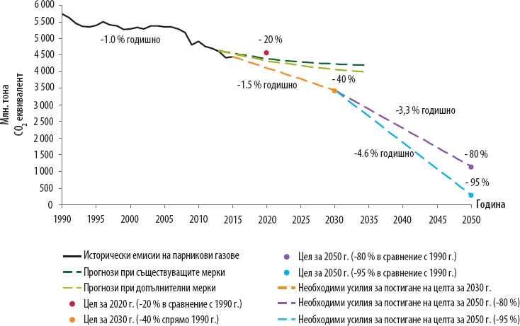 23Настоящите тенденции, прогнози и цели, както и намаленията на емисиите, необходими за постигането на целите, са показани на фигура 1. Тя показва, че целите и целевите нива за намаляване на емисиите на парникови газове за 2030 г. и 2050 г. няма да бъдат постигнати без значителни допълнителни усилия. За да бъдат изпълнени целевите нива за 2030 г., годишните усилия за намаляване на емисиите ще трябва да се увеличат наполовина през следващото десетилетие. Най-съществената промяна обаче ще бъде необходима след 2030 г., когато процентът на намаление на емисиите ще трябва да надвиши историческите нива с три до четири пъти, за да се постигне целта за 2050 г.