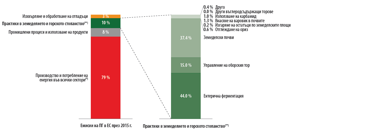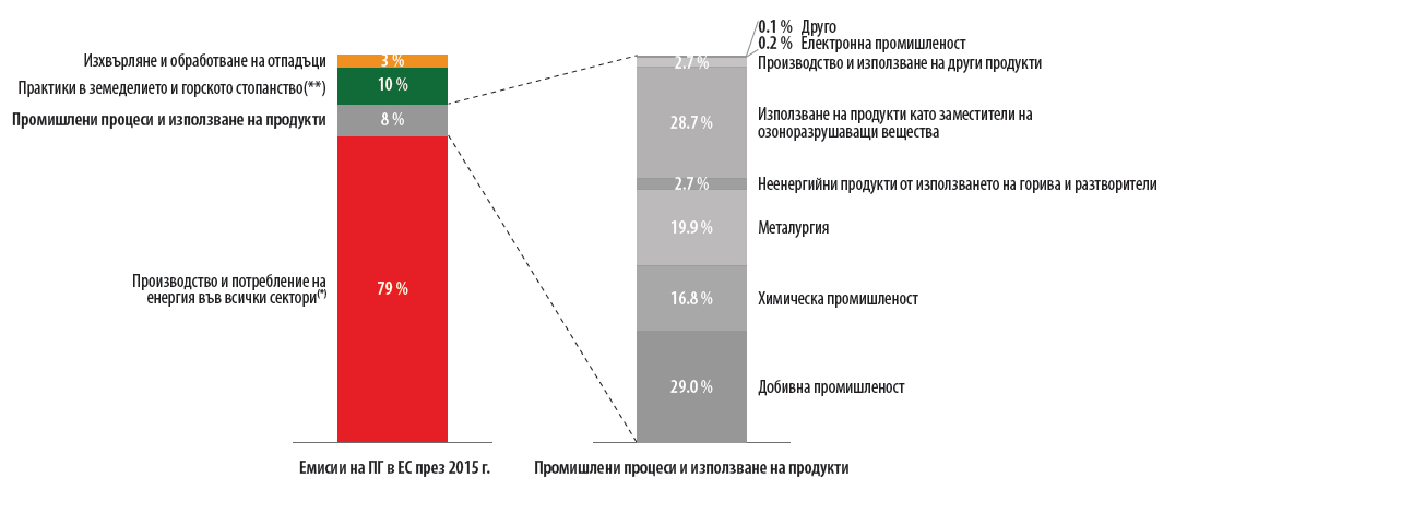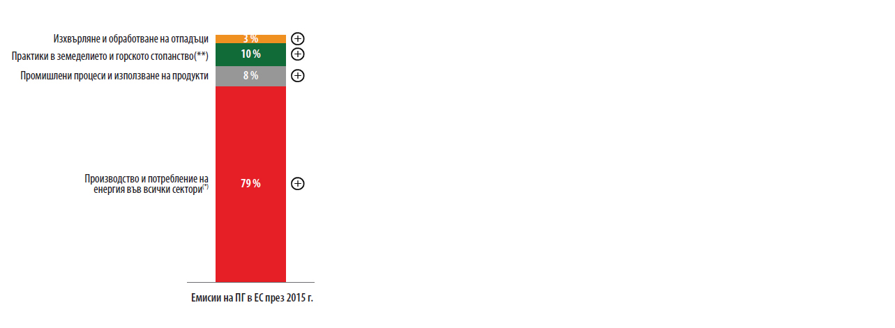 До 2014 г. ЕС вече е успял да намали емисиите си на парникови газове с повече от 20 % под равнищата от 1990 г.24 През 2015 г. обаче неговите емисии са се увеличили с 0,7 % в сравнение с 2014 г.