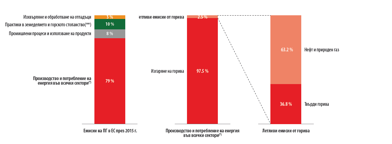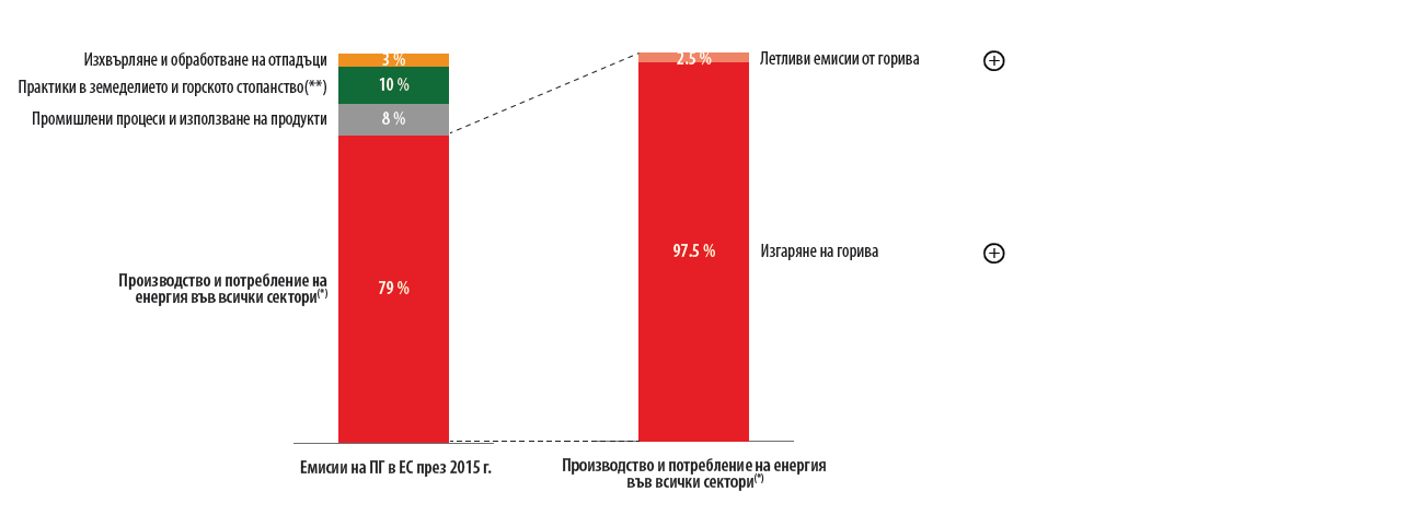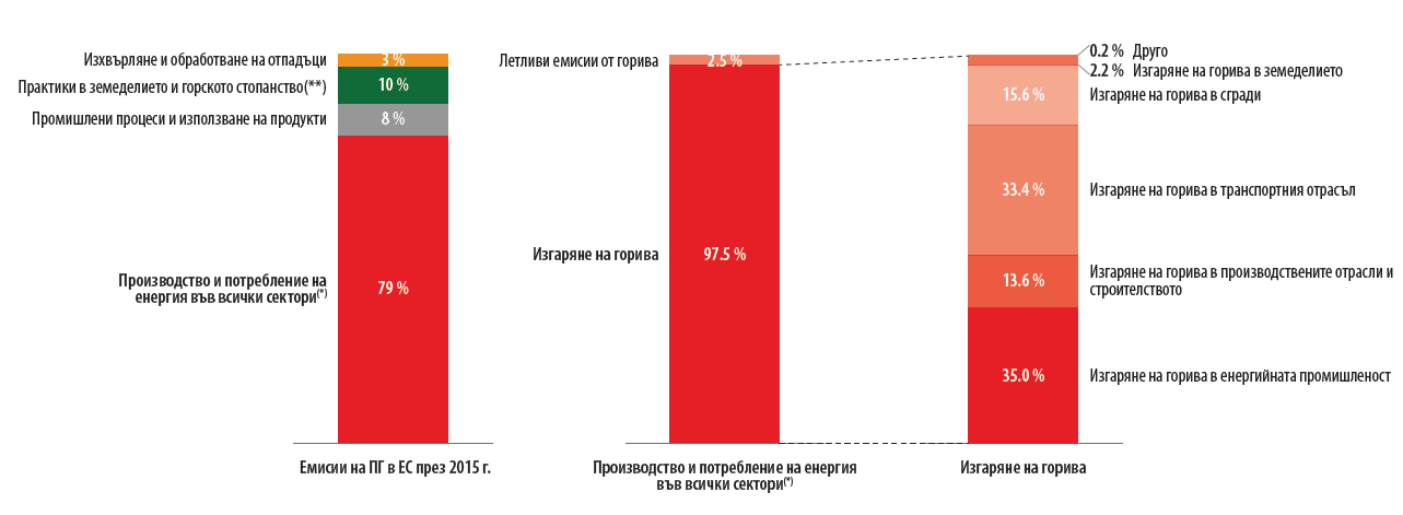 04Енергетиката и изменението на климата са тясно свързани помежду си, тъй като производството на енергия, главно от преобразуване и изгаряне на изкопаеми горива, и потреблението на енергия – например от промишлеността, домакинствата и транспорта – съставлява 79 % от емисиите на парникови газове в ЕС. В резултат на това преобразуването на производството и потреблението на енергия е от съществено значение за борбата с изменението на климата. Задоволяването на енергийните нужди, като същевременно се намалят емисиите на парникови газове, е основно предизвикателство за ЕС и неговите държави членки.