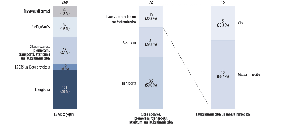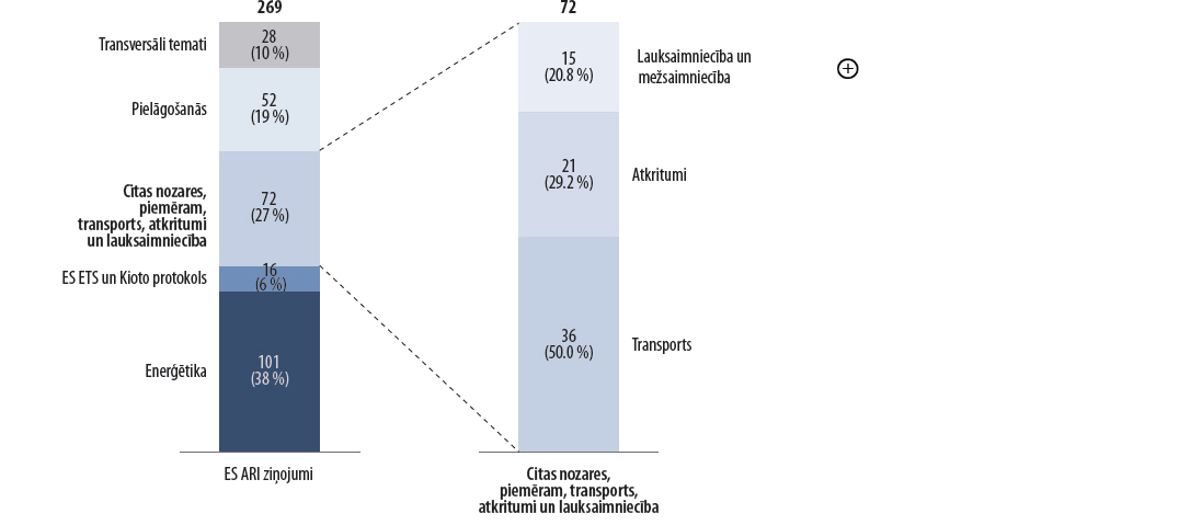 - mazināšanas darbības katrā no nozarēm, kas rada siltumnīcefekta gāzu emisijas: energoapgāde, rūpniecība, ēku nozare, transports, lauksaimniecība un mežsaimniecība, un atkritumi. Energoapgāde un enerģijas izmantošana veido 79 % no ES siltumnīcefekta gāzu emisijām, tādēļ uz šīm jomām ir likts vislielākais uzsvars;