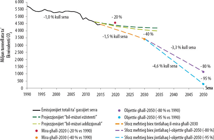 - Sal-205023: l-UE biħsiebha tnaqqas l-emissjonijiet ta’ gassijiet serra tagħha b’bejn 80 % u 95 % meta mqabblin mal-livelli tal-1990.