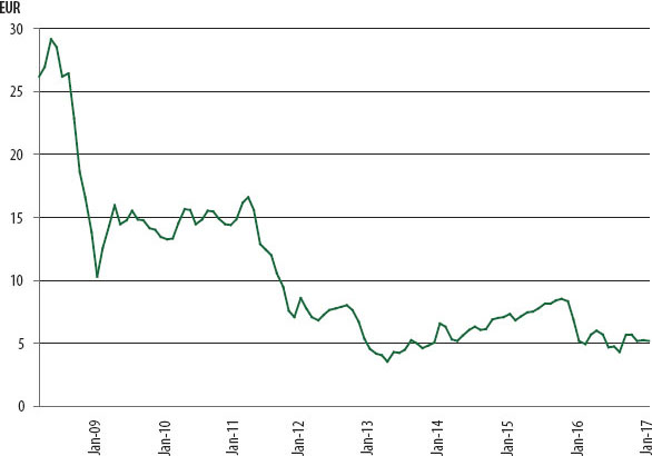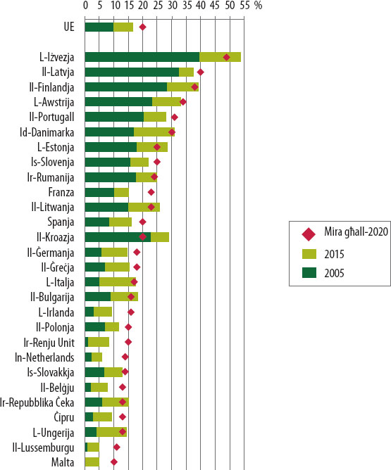 Sors: L-Aġenzija Ewropea għall-Ambjent, Trends and projections in Europe 2016 – Tracking progress towards Europe’s climate and energy targets.