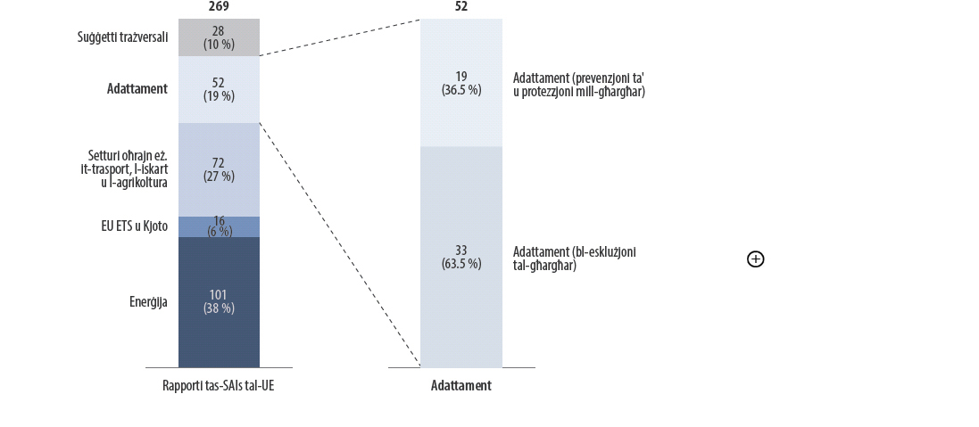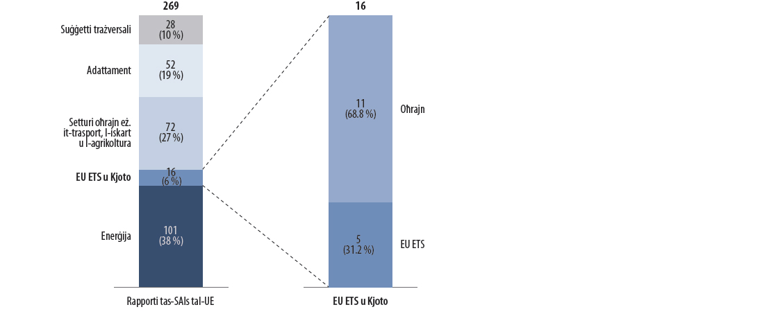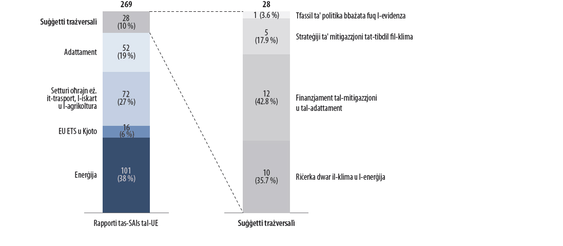XFi snin reċenti, is-SAIs u l-QEA snin awditjaw qasam wiesa’ ta’ suġġetti differenti dwar l-enerġija u t-tibdil fil-klima. Awditi dwar l-enerġija kkostitwew il-biċċa l-kbira mir-rapporti, filwaqt li suġġetti oħra, bħall-adattament, irċevew inqas attenzjoni. Għalkemm il-kopertura tal-awditjar kienet tvarja, jistgħu jiġu identifikati għadd ta’ sejbiet komuni. Mill-awditi nstab li d-differenzi fil-mod kif l-Istati Membri implimentaw il-leġiżlazzjoni tal-UE u amministraw is-swieq tal-enerġija tagħhom żamm lura l-progress lejn l-ikkompletar tas-suq intern tal-enerġija tal-UE. Minkejja ż-żieda b’suċċess fis-sorsi ta’ enerġija rinovabbli u t-tnaqqis fl-ispejjeż tagħhom globalment, l-awditi sabu nuqqas ta’ kosteffettività kif ukoll ostakoli għall-investimenti. Problemi ta’ kosteffettività ġew identifikati wkoll regolarment fl-awditi tal-effiċjenza fl-enerġija; fil-qasam tal-enerġija nukleari, is-SAIs sabu żidiet fl-ispiża kif ukoll dewmien li kienu sinifikanti. L-awditi wrew ukoll li l-bidla għal modi ta’ trasport b’livell baxx ta’ emissjonijiet tal-karbonju mhijiex qiegħda sseħħ sa livell suffiċjenti. Fil-qasam tal-adattament, l-awditi ffukaw prinċipalment fuq l-għargħar. Hawnhekk, l-awdituri sabu problemi fil-prevenzjoni tal-għargħar, fil-protezzjoni u fir-rispons.