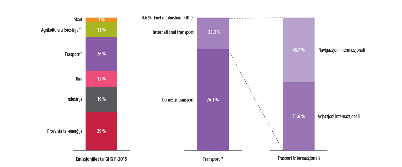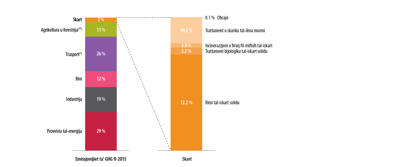 - L-azzjoni ta’ mitigazzjoni f’kull settur ta’ emissjonijiet ta’ gassijiet serra: il-provvista tal-enerġija, l-industrija, il-bini, it-trasport, l-agrikoltura u l-forestrija u l-iskart. Il-provvista u l-użu tal-enerġija jirrappreżentaw 79 % tal-emissjonijiet ta’ gassijiet serra tal-UE, u għalhekk jingħataw l-iktar enfasi;