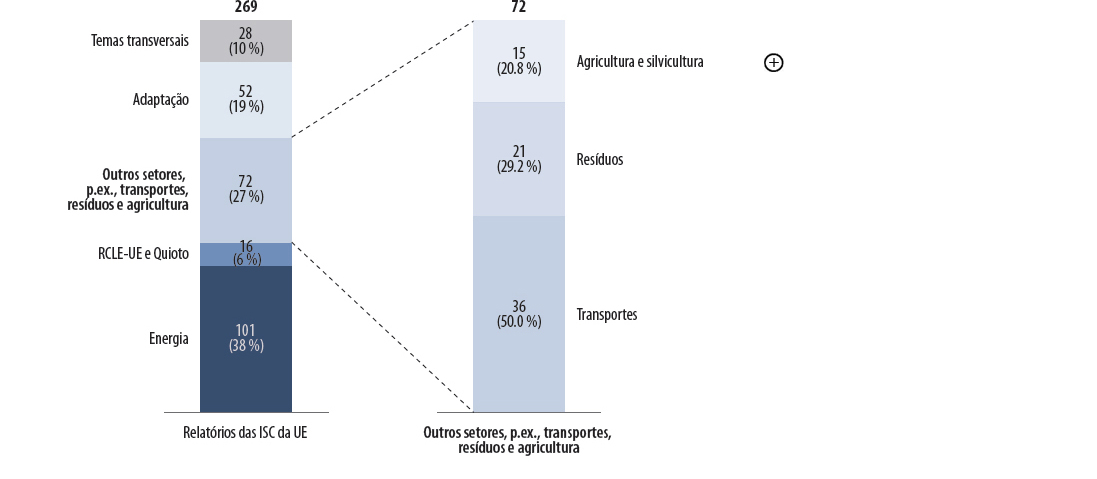 - medidas de atenuação em cada setor emissor de gases com efeito de estufa: aprovisionamento energético, indústria, edifícios, transportes, agricultura e silvicultura e resíduos. O aprovisionamento e a utilização de energia são responsáveis por 79% das emissões da UE de gases com efeito de estufa, motivo pelo qual lhes é dada maior ênfase;