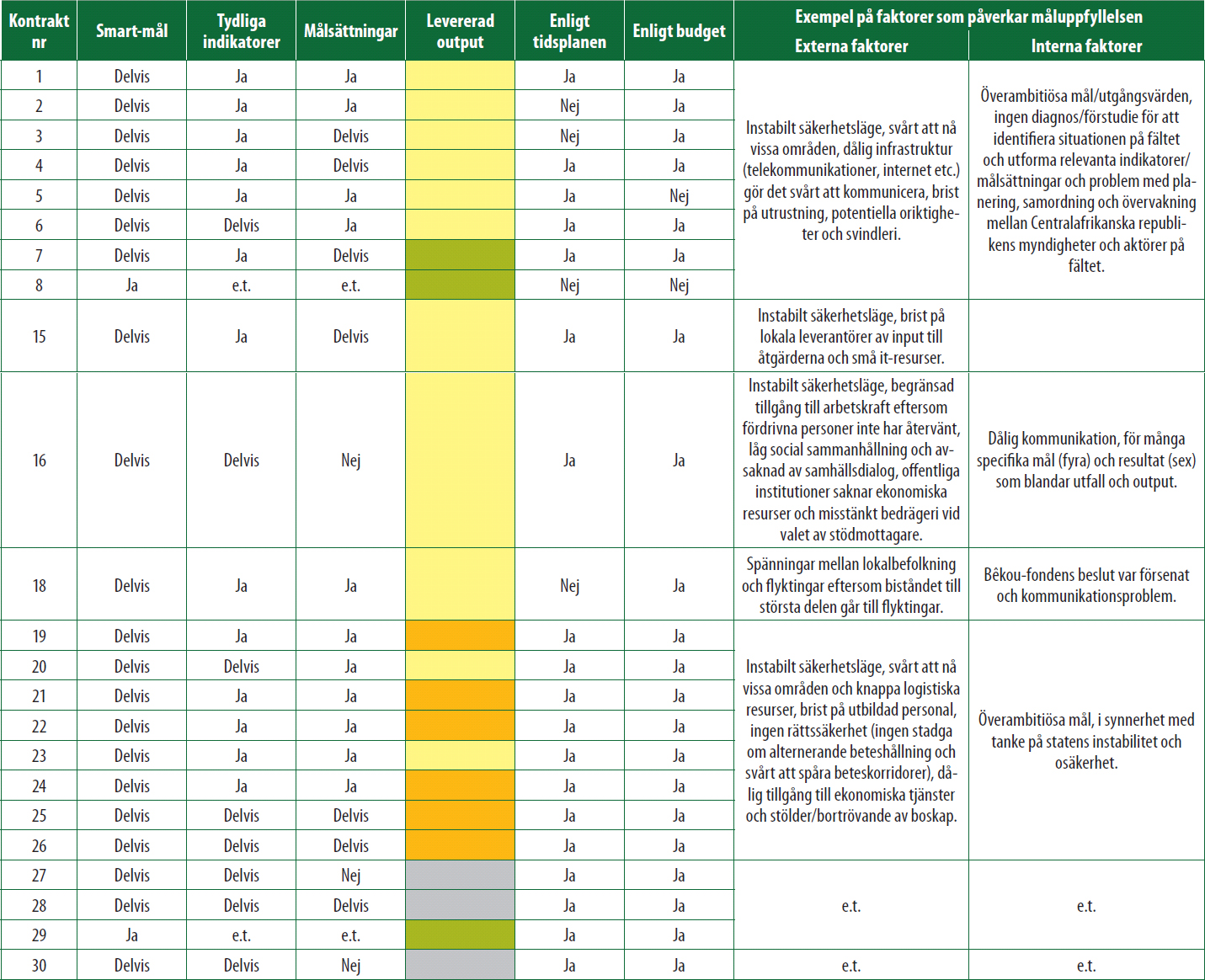 41 Se punkt 53 om de konstaterade bristerna i definitionen av mål och indikatorer. Vår analys för den här delen byggde till största delen på en skrivbordsgranskning av de tillgängliga bevisen eftersom vi bara kunde besöka tre projekt på plats. Vi använde bevis från tre källor: externa utvärderingsrapporter, delrapporter från underentreprenörer och en övervakningstabell med kontraktsindikatorer som utarbetats av Bêkou-fonden.