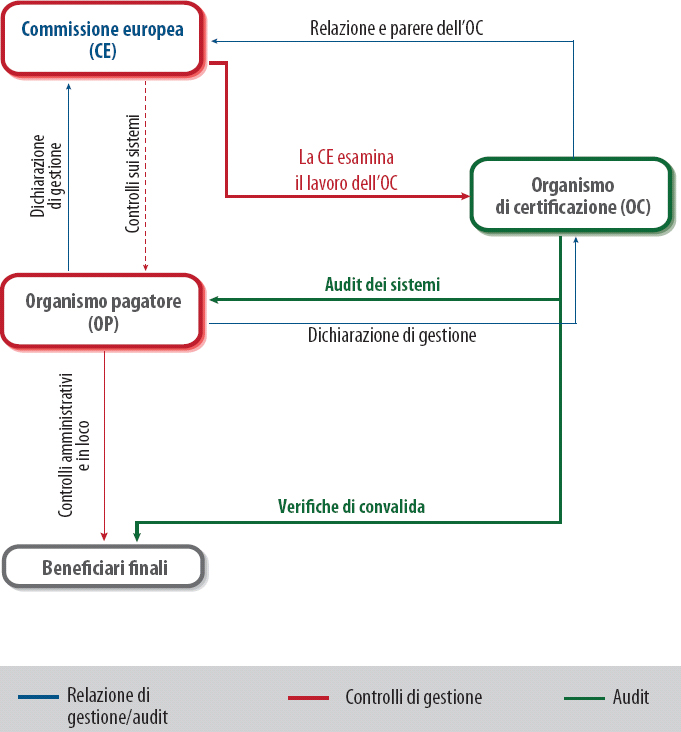 La Corte ritiene che l’approccio di «audit unico» sia il modo giusto per ottenere garanzie circa la legittimità e regolarità della spesa a livello degli Stati membri. Nel diritto dell’UE, proprio come la Corte dei conti europea funge da revisore esterno per il bilancio dell’UE nel suo complesso, gli OC fungono da autorità di audit, indipendente sotto il profilo operativo, della spesa agricola a livello di Stato membro e/o regionale. Essi sono i primi auditor, in ordine cronologico, a fornire garanzie sulla legittimità e regolarità della spesa agricola e costituiscono l’unica fonte di garanzie analoghe a livello nazionale/regionale28. Gli OC ricavano le loro certezze combinando le proprie verifiche di convalida con i sistemi di controllo degli OP. Come si evince dal grafico 2, nel contesto di un modello di «audit unico» per la PAC del periodo 2014-2020, tali garanzie potrebbero essere potenzialmente utilizzate dalla Commissione, purché sia assicurata una pista di audit adeguata.