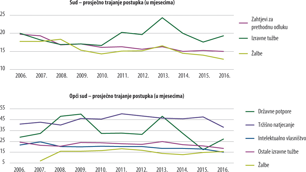 Te su mjere na oba suda doprinijele skraćivanju vremena koje je u prosjeku potrebno za donošenje sudskih odluka. Na primjer, 2016. godine postupci su u prosjeku trajali ukupno 14,7 mjeseci pred Sudom i 18,7 mjeseci pred Općim sudom, što je smanjenje za redom 0,9 i 1,9 mjeseci u odnosu na 2015. Međutim, zasad se ne može potvrditi da je silazni trend zabilježen za svaku vrstu postupka (vidi sliku 2.).