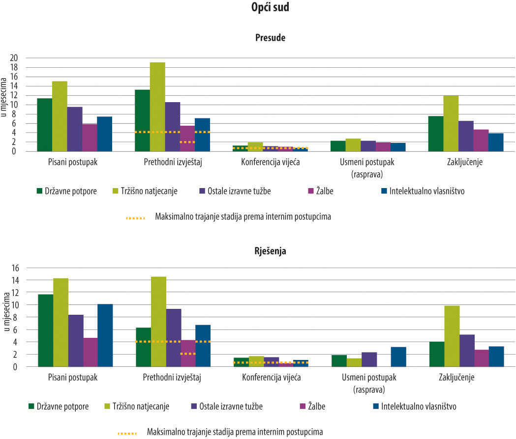 29 Radi cjelovitosti podataka, prosječno trajanje predmeta koji su riješeni donošenjem rješenja, raščlanjeno po ključnim stadijima, prikazano je na slici 4. Međutim, valja napomenuti da, za razliku od predmeta koji se rješavaju presudama i koji moraju proći sve stadije postupka, predmeti u kojima se donosi rješenje mogu biti zatvoreni u različitim stadijima postupka i zbog mnogo različitih razloga.