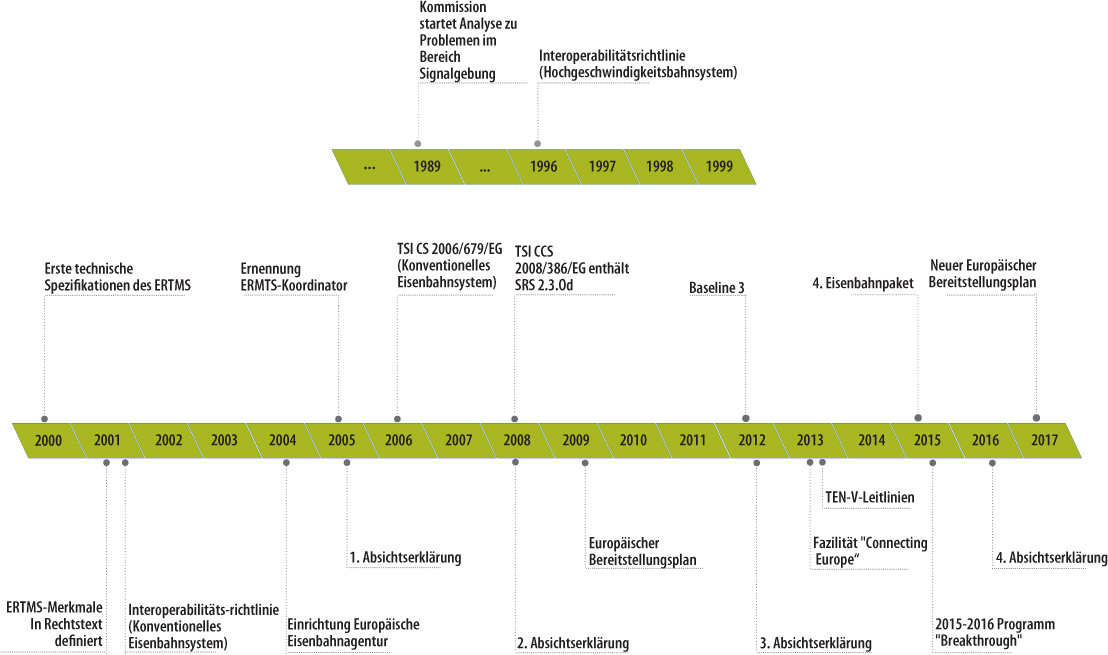 09Das Konzept eines einheitlichen EU-Signalgebungssystems zur Verbesserung der Interoperabilität geht zurück auf das Jahr 1989, als die Eisenbahnindustrie und die Kommission eine Analyse zu Problemen im Bereich der Signalgebung in den EU-Mitgliedstaaten in die Wege leiteten, und hat sich seither kontinuierlich weiterentwickelt, wie in Abbildung 2 zusammengefasst.
