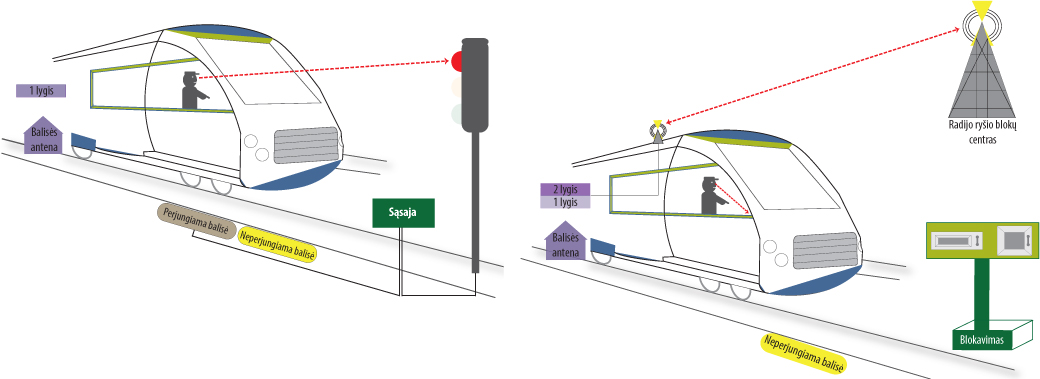 - 2 lygis – nuolatinis traukinio judėjimo valdymas ir tarp traukinio ir kelio nuolat palaikomas GSM-R ryšys. Bėgių kelio signalizacija nebūtina.