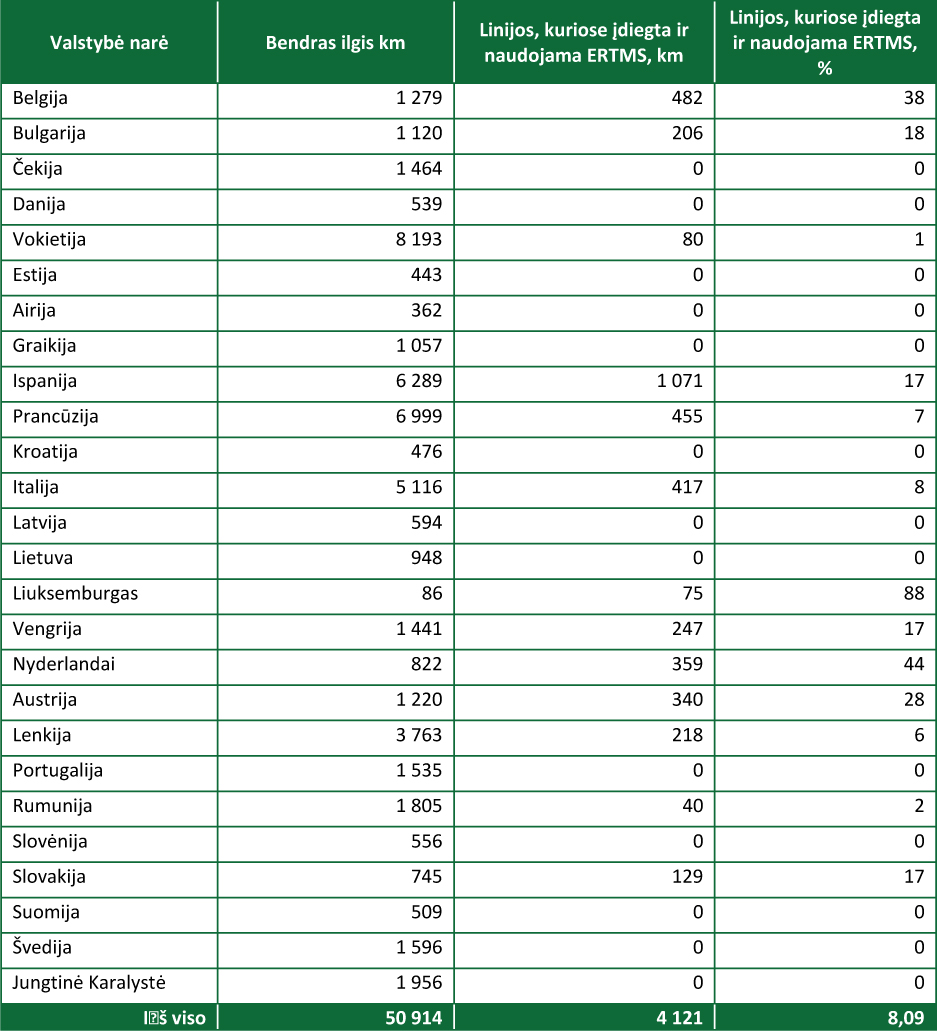 26ERTMS, Europos bendros signalizacijos sistemos, koncepcija suformuluota praėjusio amžiaus dešimtąjį dešimtmetį priėmus strateginį politinį sprendimą kurti bendrą Europos geležinkelių erdvę. Pirmoji prievolė teisės aktuose nustatyta dar 1996 m., vėliau priimta daug teisėkūros procedūra priimtų aktų, kuriais nustatyta, kad diegti ERTMS privaloma ir greituosiuose, ir paprastuosiuose geležinkeliuose. Tačiau šios teisės aktais nustatytos prievolės nebuvo pagrįstos kokia nors bendrų sąnaudų analize, kurią atlikus būtų galima nustatyti būtiną finansavimą ir jo šaltinius21.