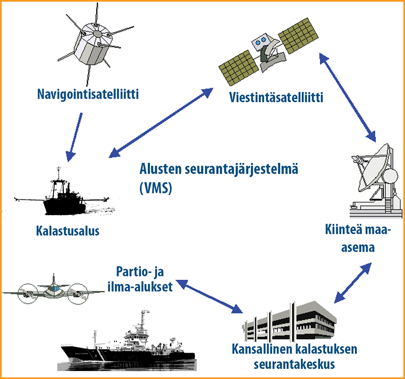 Alusten seurantajärjestelmä: Kalastusalusten satelliittiseurantajärjestelmä, joka välittää kalastusviranomaisille (kalastuksen seurantakeskuksille) säännöllisin väliajoin tiedot alusten sijainnista, kurssista ja nopeudesta.