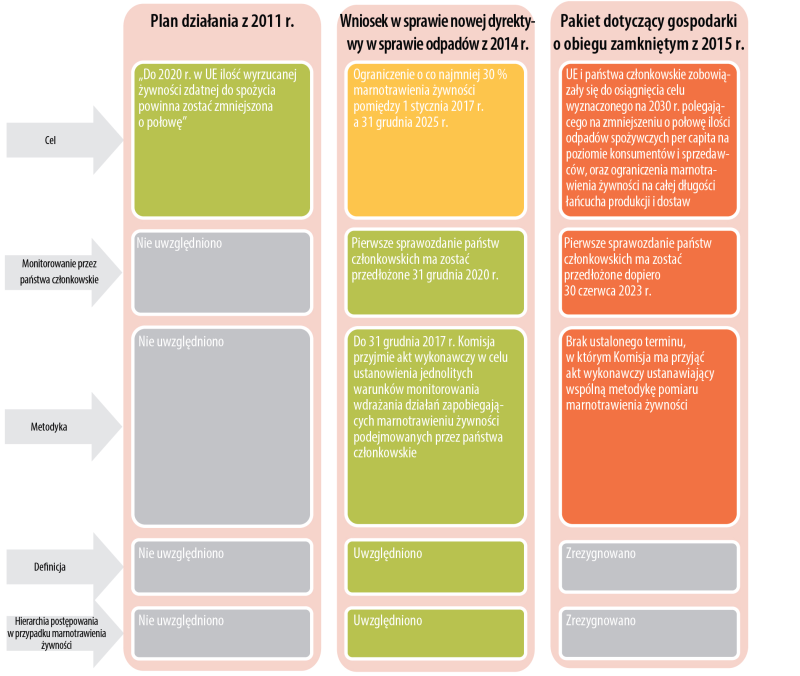 Podczas analizy tych dokumentów stwierdzono jednak, że ambicje Komisji w odniesieniu do marnotrawienia żywności zmniejszały się na przestrzeni czasu. Jak pokazano na rys. 3, wartości docelowe w zakresie redukcji marnotrawstwa zostały obniżone, odroczono terminy w zakresie obowiązku sprawozdawczości państw członkowskich na temat marnotrawienia żywności, kilkukrotnie odraczano termin przyjęcia przez Komisję aktu wykonawczego w celu ustanowienia wspólnej metody pomiaru poziomu marnotrawienia żywności, a ponadto wciąż nie ma ogólnounijnej definicji marnotrawienia żywności. Nie określono też dotychczas poziomu podstawowego służącego za punkt odniesienia w działaniach zmierzających do ograniczenia marnotrawienia żywności (zob. ramka 1).