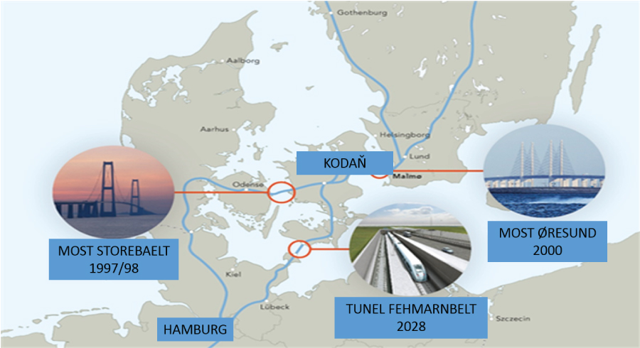 - Pevné spojenie cez úžinu Fehmarn Belt: železničné/cestné spojenie medzi Dánskom a Nemeckom (v škandinávsko-stredomorskom koridore);