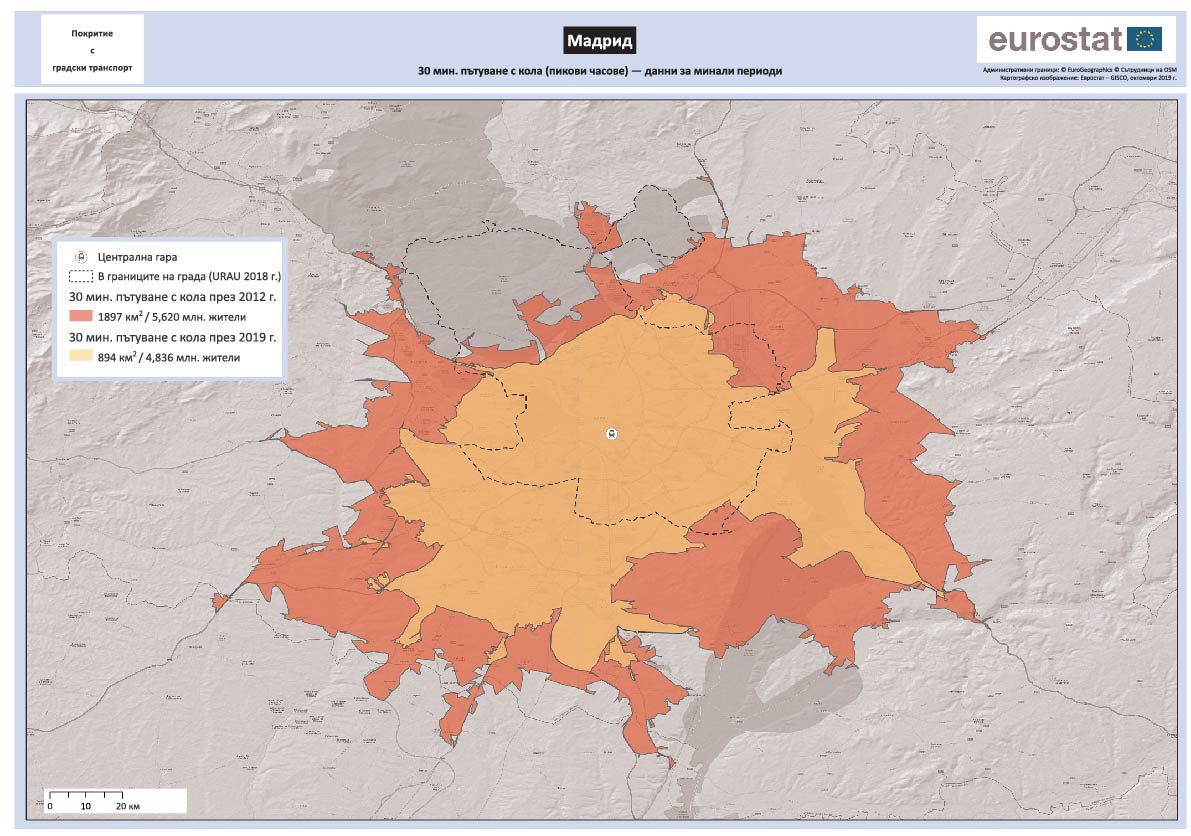 Сравнителна достъпност на железопътна гара Atocha в Мадрид с автомобил и с обществен транспорт (транзитно преминаване)