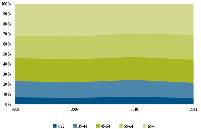 6 Eurostat prezintă date pentru următoarele grupe de vârstă: sub 35 de ani, 35-44 de ani, 45-54 de ani, 55-64 de ani, peste 65 de ani.