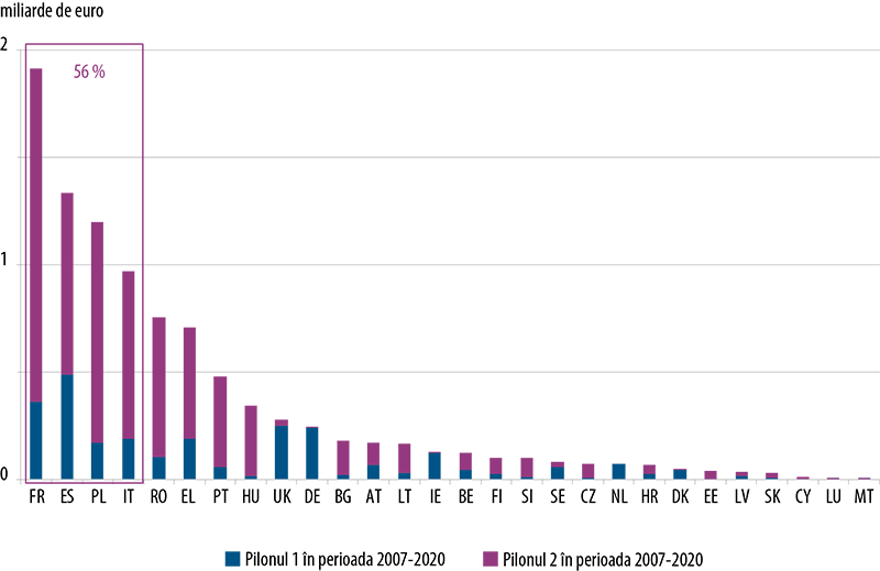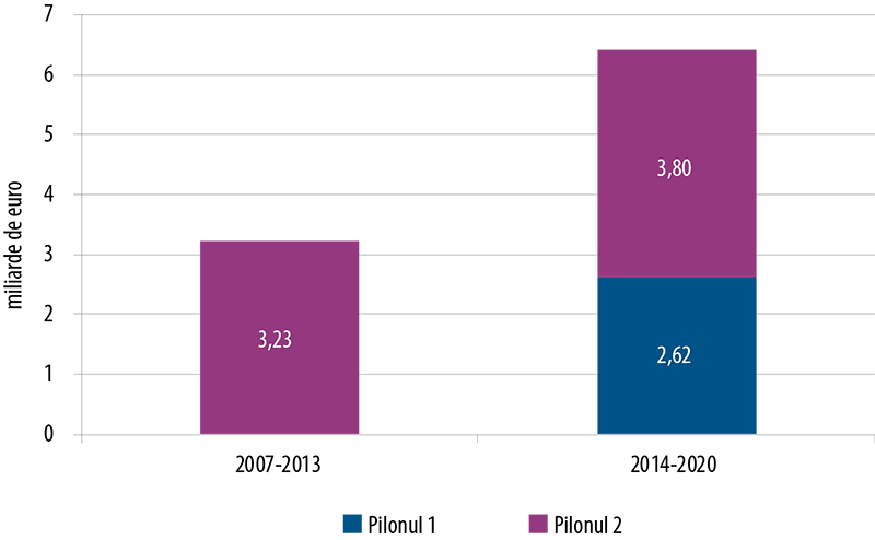 Sursa: Curtea de Conturi Europeană, pe baza datelor Comisiei (cheltuieli din perioada 2007-2013 și alocări pentru perioada 2014-2020).