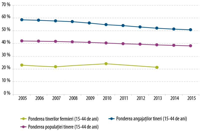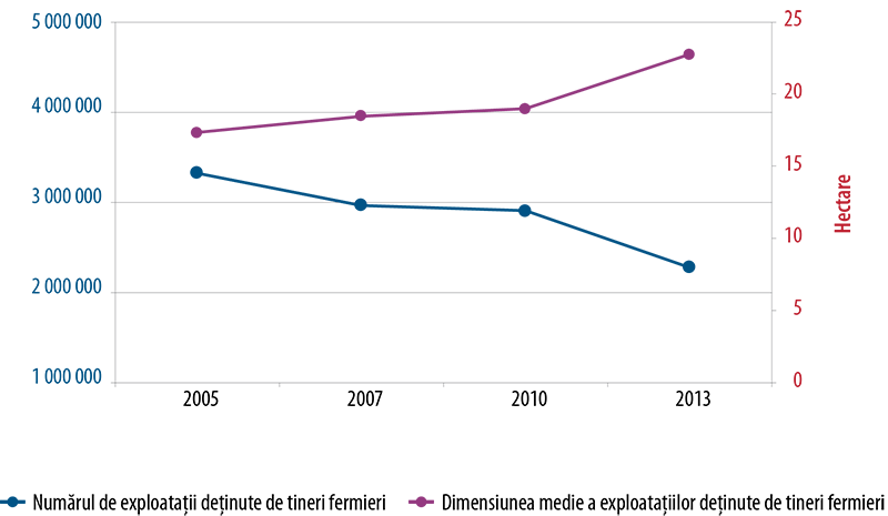 Numărul tinerilor fermieri (sub 44 de ani) a scăzut de la 3,3 milioane în 2005 la 2,3 milioane în 2013, ceea ce reprezintă o reducere cu o treime în mai puțin de un deceniu. Cu toate acestea, procentul reprezentat de tinerii fermieri în populația agricolă a rămas relativ stabil, la puțin peste 20 % (a se vedea figura 2).