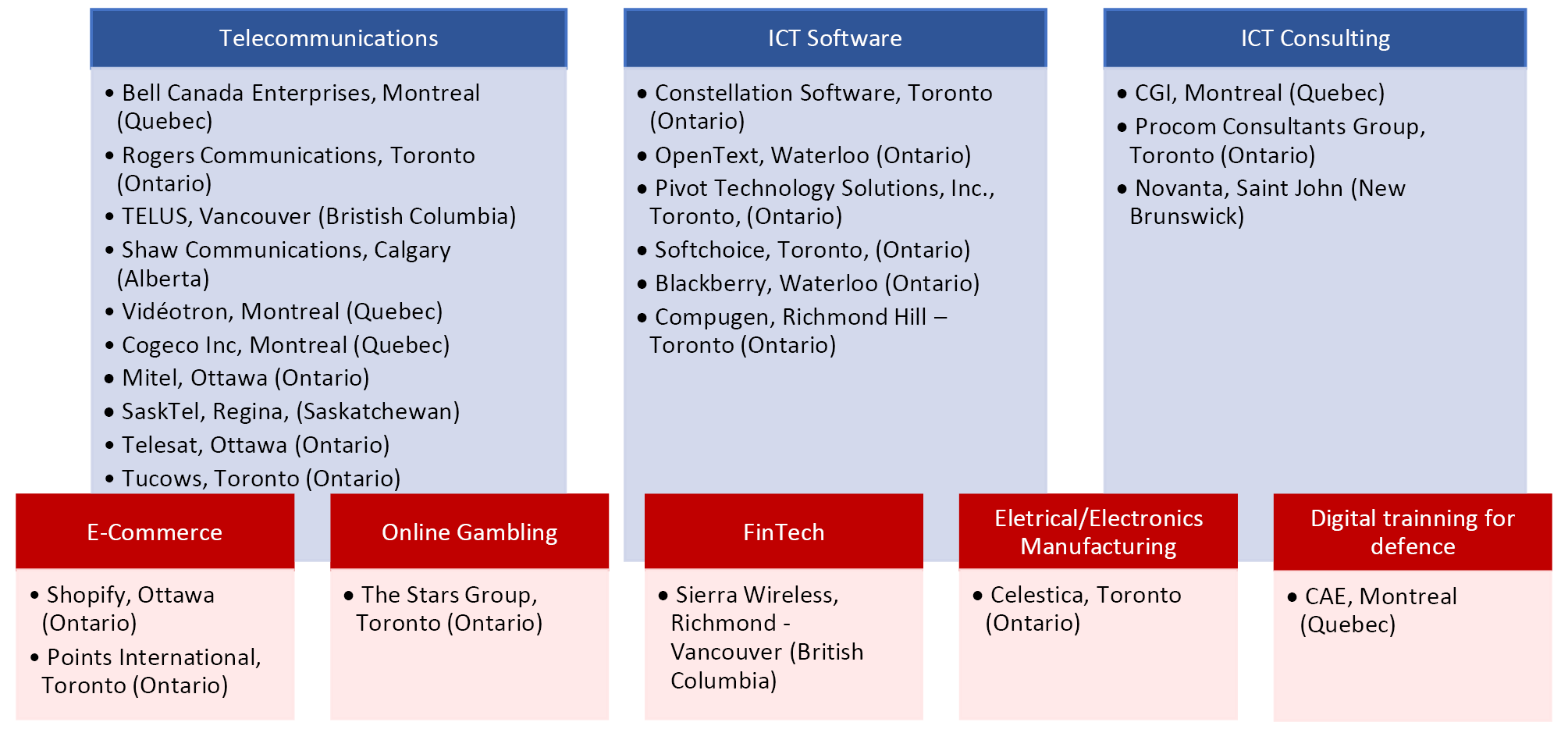 Canada’s ICT sector is home to over 41 500 companies, encompassing everything from innovative startups to large multinationals. The Canadian ICT sector has been growing consistently for over a decade, and over the last 5 years it has outpaced the growth of the Canadian economy as a whole. As technology plays an increasing role across the economy, various levels of the Canadian government are investing in research and development (R & D) as well as adopting technologies to provide a better quality of life for Canadians. Interestingly, while the ICT sector only represents 5 % of the total Canadian economy, it is responsible for approximately 35 % of all private-sector R & D in Canada.